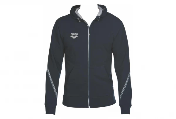 Keep your muscles warm with our soft cotton hooded jacket. Improved design with its comfortable straight cut, two very useful pockets and contrasting sleeves. This sweatshirt also has an adjustable hood with its drawstring, a solid zipper surrounded by reflective trims and our logo. Perfect for enhancing your appearance at sporting or aquatic events.